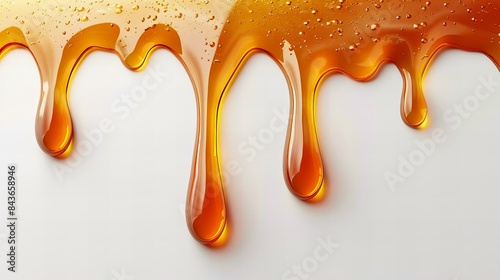 Close-up of golden honey dripping against a white background, creating a mesmerizing and smooth texture.