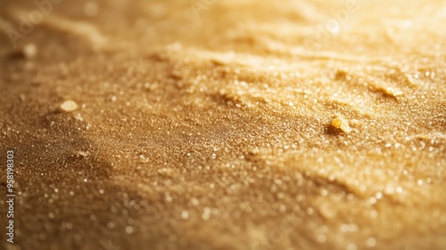 Close-up of golden sand with sparkling textures, capturing the fine grains and subtle waves under warm sunlight. The image focuses on the details of the sandy surface.