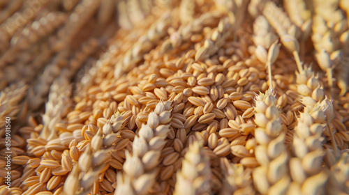 Close-up of golden wheat grains and ears basking in the warm sunlight, highlighting the textures and abundance of the crops.