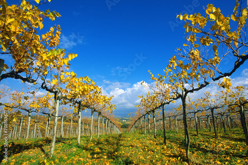closeup of grapevines in autumn, fall, with yellow, ornage leaves, near San Gimignano in Chianti region, Tuscany, Italy