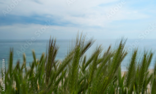 Close-up of green beach grass with blurred ocean and cloudy sky in the background, evoking a peaceful natural scene