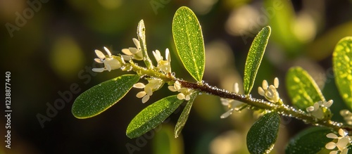 Close-up of green leaves and small white flowers with dew drops on a branch against a blurred background Copy Space
