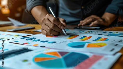 Closeup of Hand Analyzing Charts and Graphs Illustration