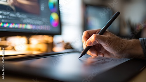 Close-up of hand drawing on a digital tablet, computer in background