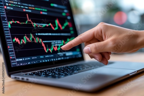 Close-Up of Hand Pointing at Stock Market Chart on Laptop Screen, Focus on Candlestick Charts and Trading Data