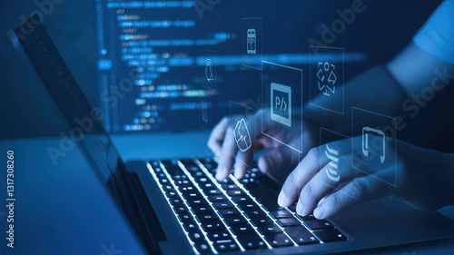 close-up of hands of person actively typing or interacting with laptop keyboard. lines of computer code, and digital overlay of translucent icons and avatars.