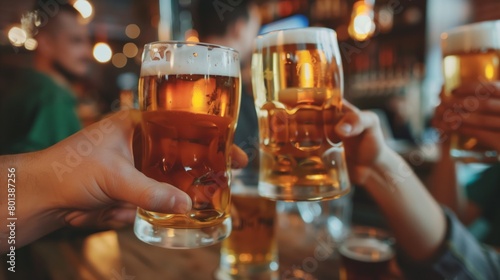 Close-up of hands toasting with beer mugs in a crowded bar, cheerfully celebrating.