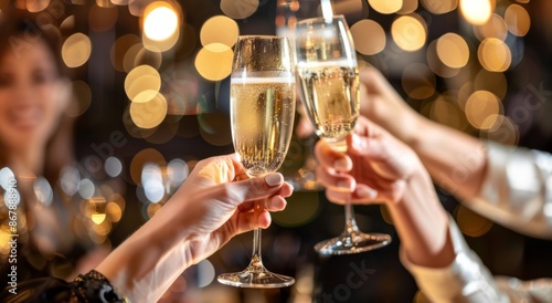 Close-up of hands toasting with champagne glasses at party, blurred background. Happy friends celebrating new year or other special events in restaurant.