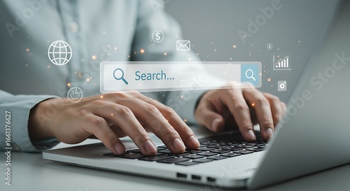 Close-up of hands typing on a laptop keyboard with a search bar overlay.