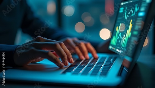 Close-up of hands typing on a laptop keyboard with data charts overlaid, modern digital workspace
