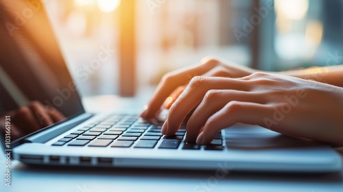 Close-up of hands typing on a laptop keyboard with sunlight streaming through a window, symbolizing productivity and modern technology.