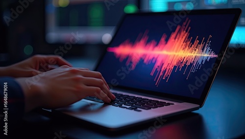 Close-up of hands typing on a laptop with a colorful audio waveform display.
