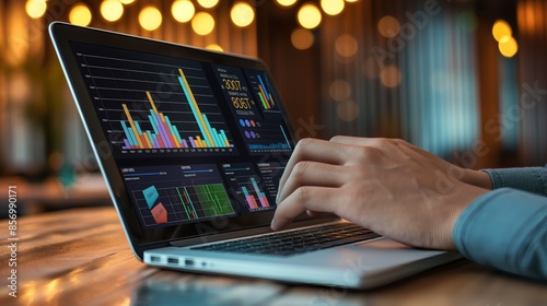 Close-up of hands typing on a laptop with data analysis charts on the screen, set in a modern office environment with warm lighting.