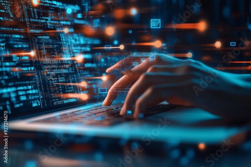 Close-up of hands typing on a laptop with glowing data flowing from the keyboard to the screen, illustrating a futuristic business concept.