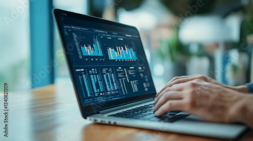 Close-up of hands typing on laptop displaying data analytics in a bright indoor workspace
