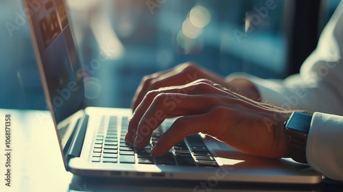 Close-up of hands typing on laptop keyboard in warm ambient lighting