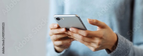 Closeup of hands using mobile phone young man texting on smartphone over light grey background