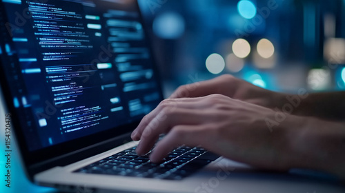 Close-up of hands working on a laptop in a minimalist workspace, representing focus and digital creativity hands, laptop, minimalist workspace, focus, digital creativity, productiv