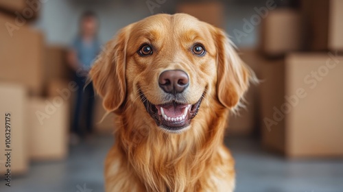 Closeup of happy golden retriever dog with warm expression, smiling face, friendly pet, indoors with cardboard boxes, moving day, loyal companion, joyful pet portrait
