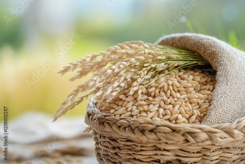 Close-up of Harvested Paddy in a Basket with Soft Indoor Lighting and a Blurred Background Featuring Natural Green Elements