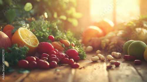 Close-up of healthy food with various vitamin-rich foods such as fruits, vegetables and nuts on a wooden table. Generative AI