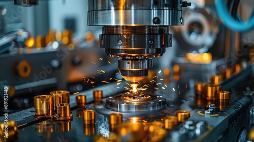 Close-up of heavy machinery operating in a factory, precision engineering equipment, advanced manufacturing technology, industrial machinery in action, high-tech production, copy space