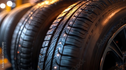 Close-up of high-performance tires displayed in an automotive shop during evening hours