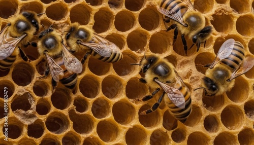 Close-Up of Honey Bees on Honeycomb: Detailed View of a Beehive with Busy Bees and Honey Cells