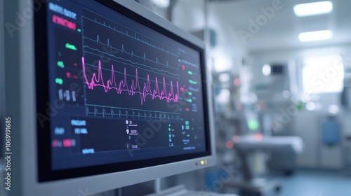 Close-up of hospital ECG monitor showing heart rhythms and patient data in real-time, highlighting cardiac monitoring in a clinical setting.