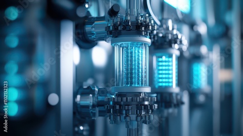 Close-up of Hydrogen Fuel Cell Generator System in Advanced Research Laboratory: Cutting-Edge Tech, Controlled Lighting, and Ultra-Precise Commercial Photography.
