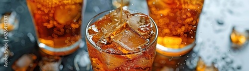 Close-up of iced tea in a glass with ice cubes.