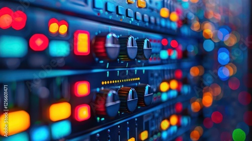 Close-up of illuminated audio equipment with colorful LED lights in a studio setting