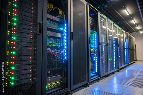 Close-up of Illuminated Server Racks in a Data Center with Long Exposure Effects, Capturing the Digital Infrastructure, Technology, and Connectivity in a Modern IT Environment