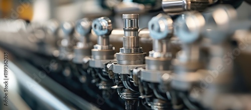 Close-up of industrial engine manifold and valve components in a factory setting with metallic colors and empty space for copy on blurred background