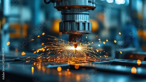 Close-up of industrial laser cutting machine in action, sparks flying from metal sheet.
