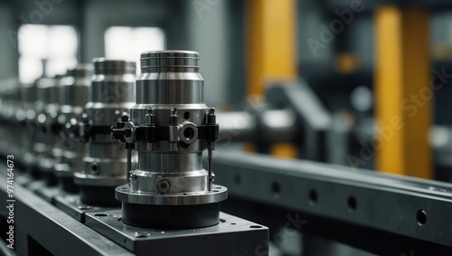 Close-up of industrial machinery with precise mechanical components and metal parts in a factory setting, showcasing engineering and technology