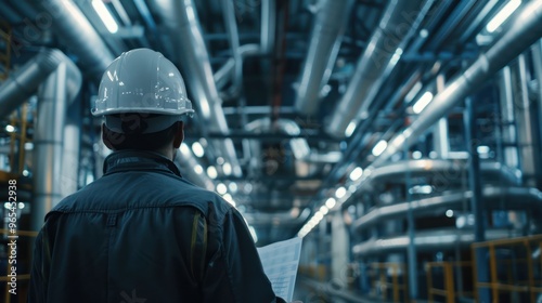 close-up of industrial pipes of oil refinery, back of engineer, technician, reading drawing, drawing, industrial engineering, blueprint, industrial background.