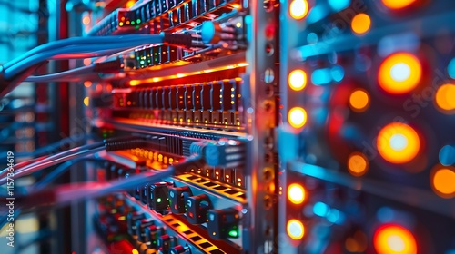 Close-up of interconnected network servers and cables with glowing lights. Focus on the complexity of data infrastructure and technological connectivity.