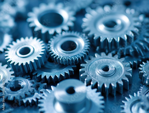 Close-Up of Interlocking Metal Gears in Blue-Tinted Light