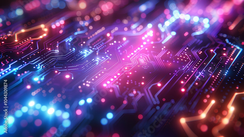 Close-Up of Intricate Digital Circuitry with Glowing Lines and Vibrant Colors