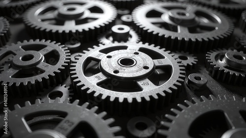 Close-up of intricate metal gears interlocked, showcasing precision engineering and complex machinery. Ideal for technology, industry, and teamwork concepts.