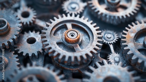 Close-up of intricate rusty metal gears interlocking, depicting complex machinery and engineering.