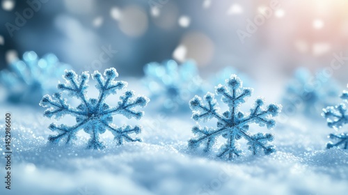 Close-up of intricate snowflakes resting on a blanket of fresh snow, capturing winter's beauty