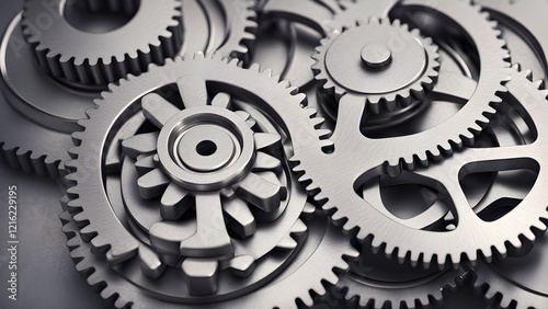 Close-up of intricately interlocking metallic gears, representing concepts of precision, machinery, and teamwork.