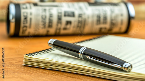 Close-up of journalist's pen and notebook on wooden desk with newspaper clippings, symbolizing press freedom and media reporting in modern society.