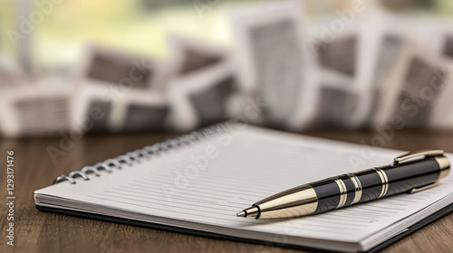 Close-up of journalist's pen and notebook on wooden desk with newspaper clippings, symbolizing press freedom and media reporting in modern society.