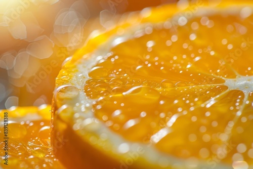 Close-up of Juicy Orange Slice with Water Droplets and Bokeh Background