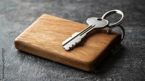 Close-Up of Key on Wooden Keychain against Dark Surface Background