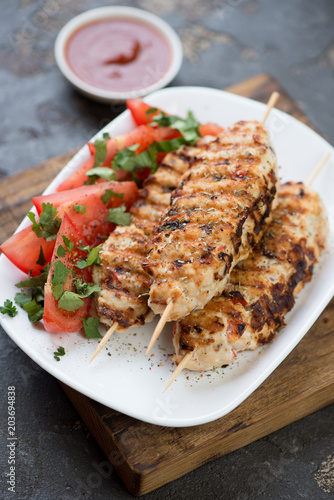 Close-up of lula kebabs made of chicken meat and served with vegetables, studio shot, selective focus