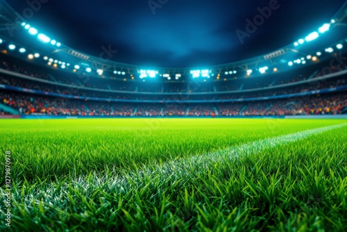 Close-up of lush green grass on a football stadium field with bright lights and a blurred crowd in the background. Concept of sports and competition. Ai generative